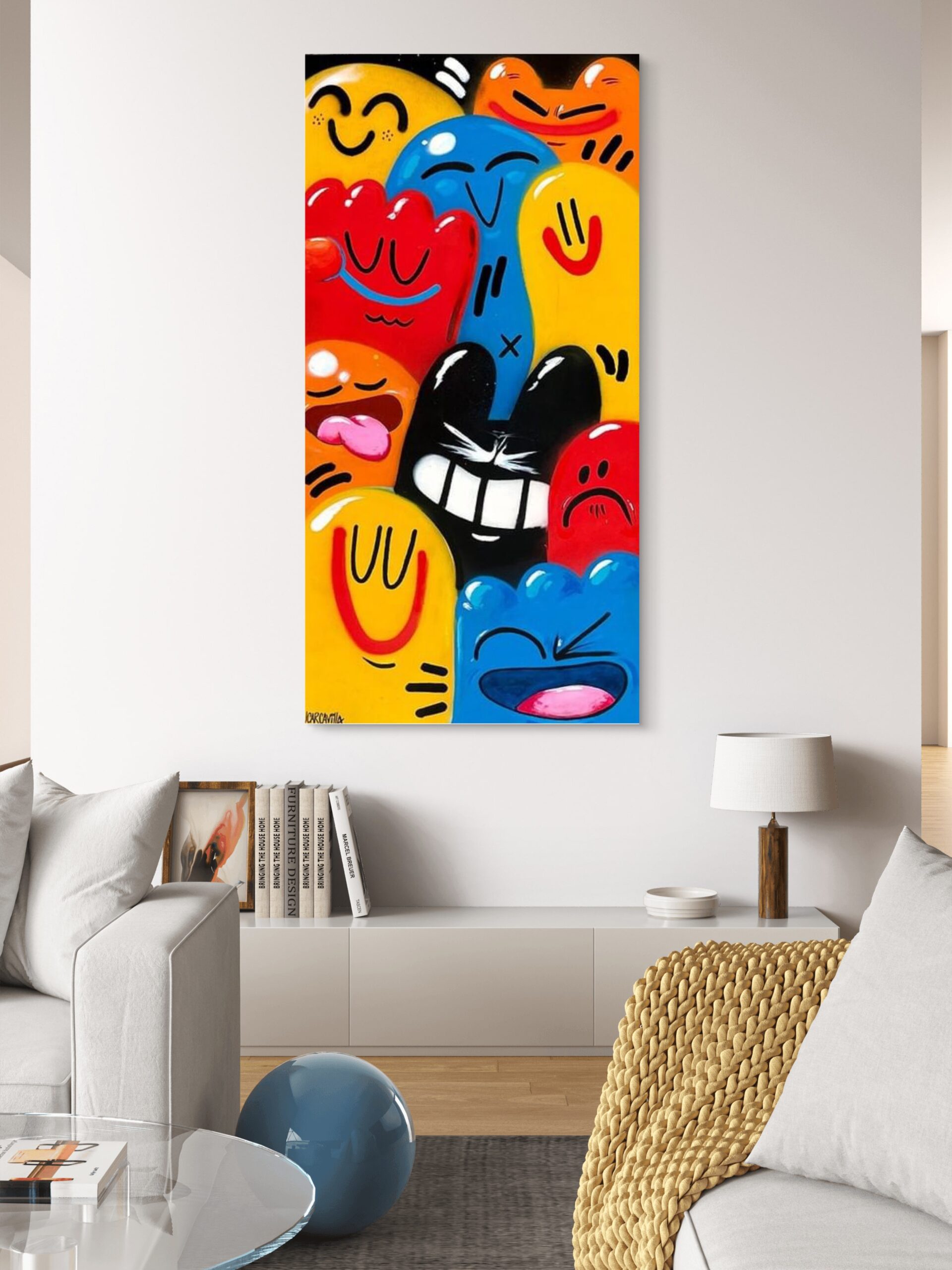 Rostros que se agrupan, que se pisan, que se abrazan visualmente en una explosión de color y energía positiva. No hay tensión, hay convivencia. No hay caos, hay celebración. Es una escena donde cada expresión suma, donde cada gesto aporta una chispa distinta a un mismo estado: disfrutar.