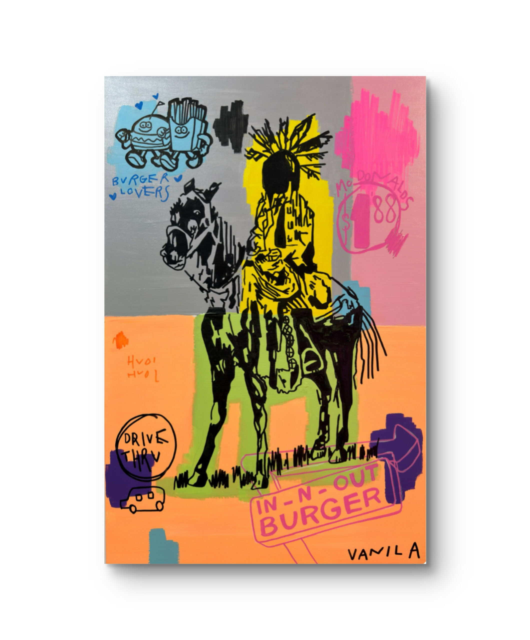 Vanila rompe el mito del cowboy solitario y lo lanza directo contra la iconografía del consumo contemporáneo. Burgers, neones, señales… todo convive en una narrativa irónica y brutalmente actual.