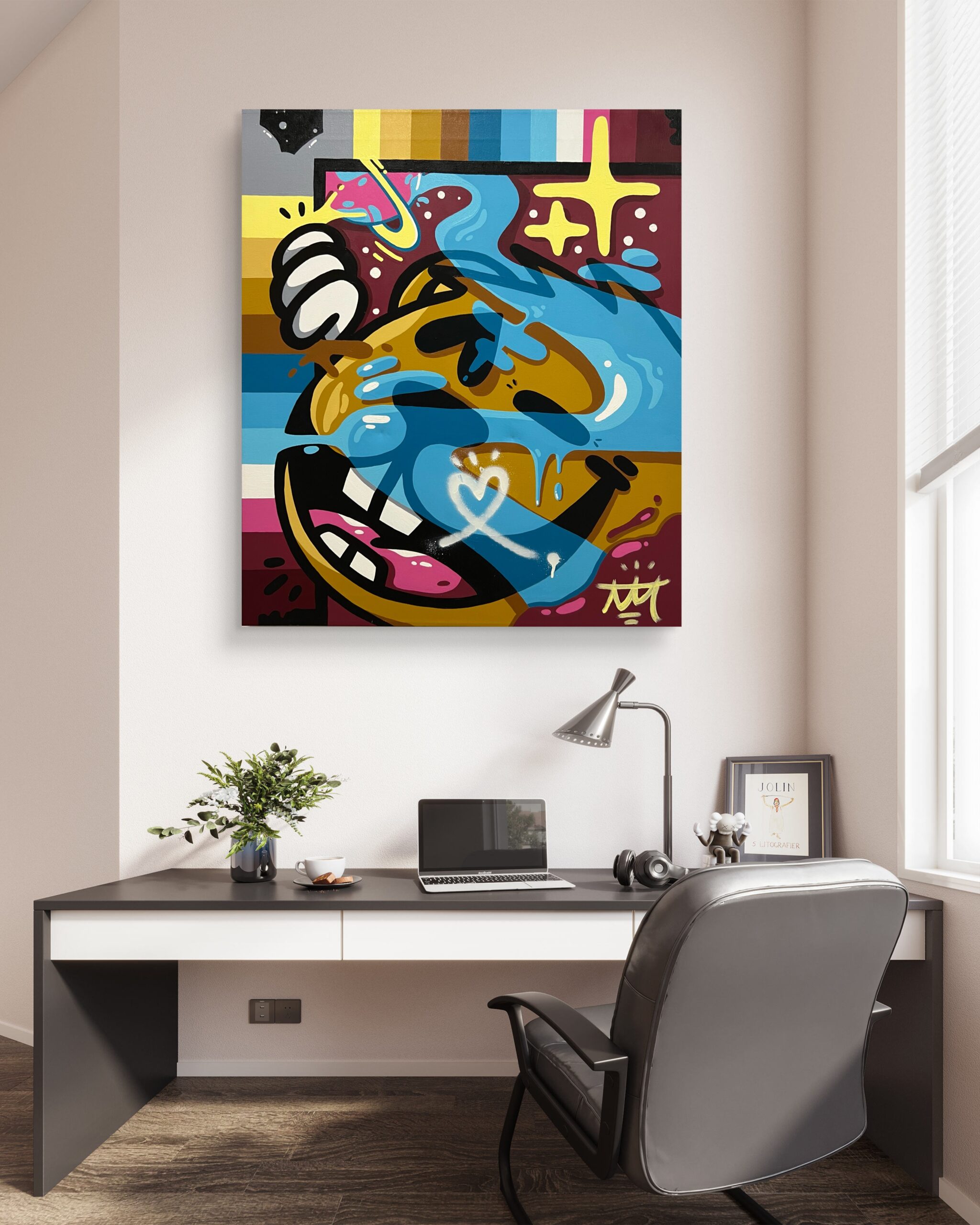 Topo utiliza su lenguaje urbano —contornos marcados, planos vibrantes, chorreados y símbolos gráficos— para hablar de algo profundamente personal: la intensidad de sentir desde dentro.