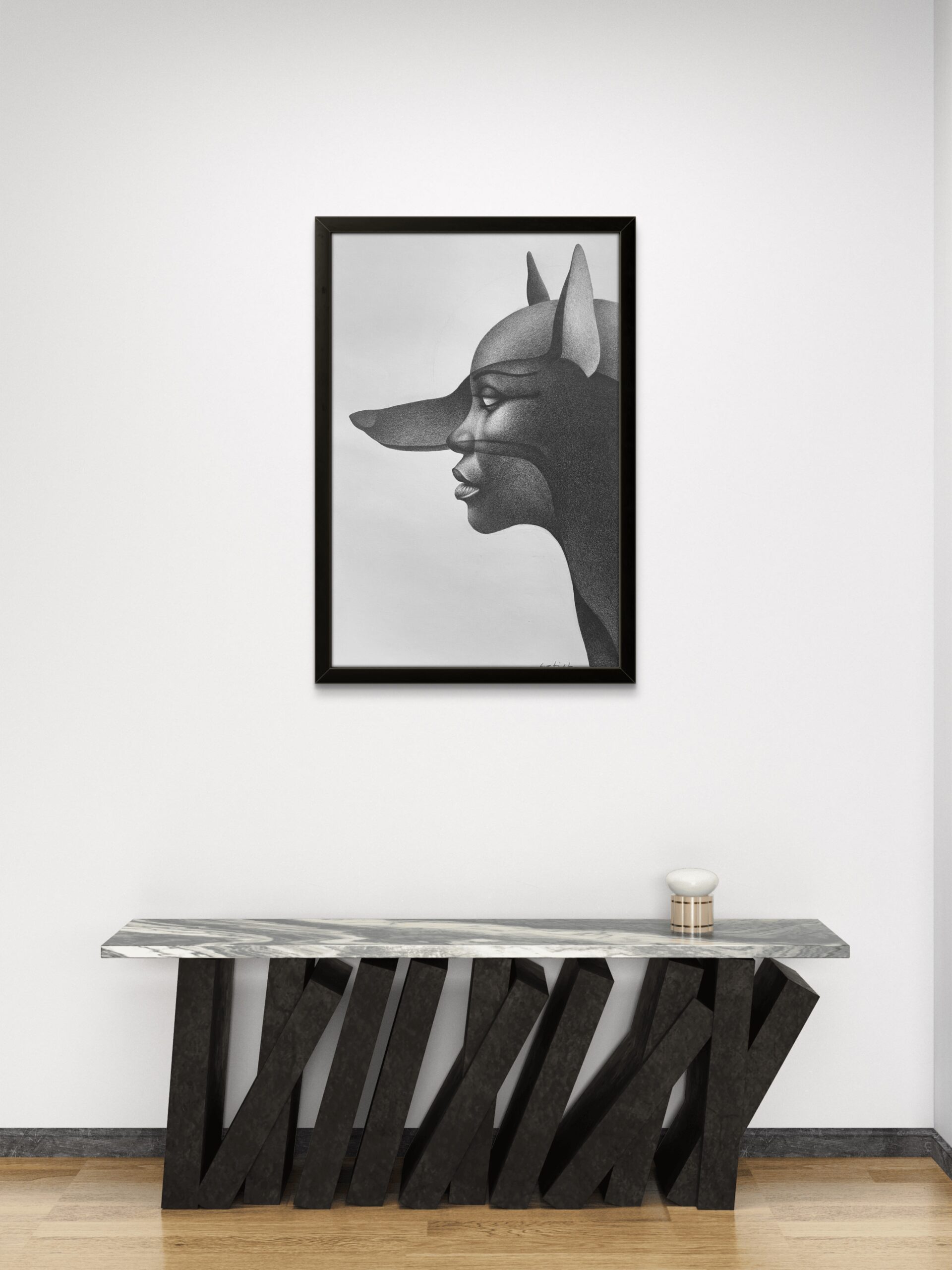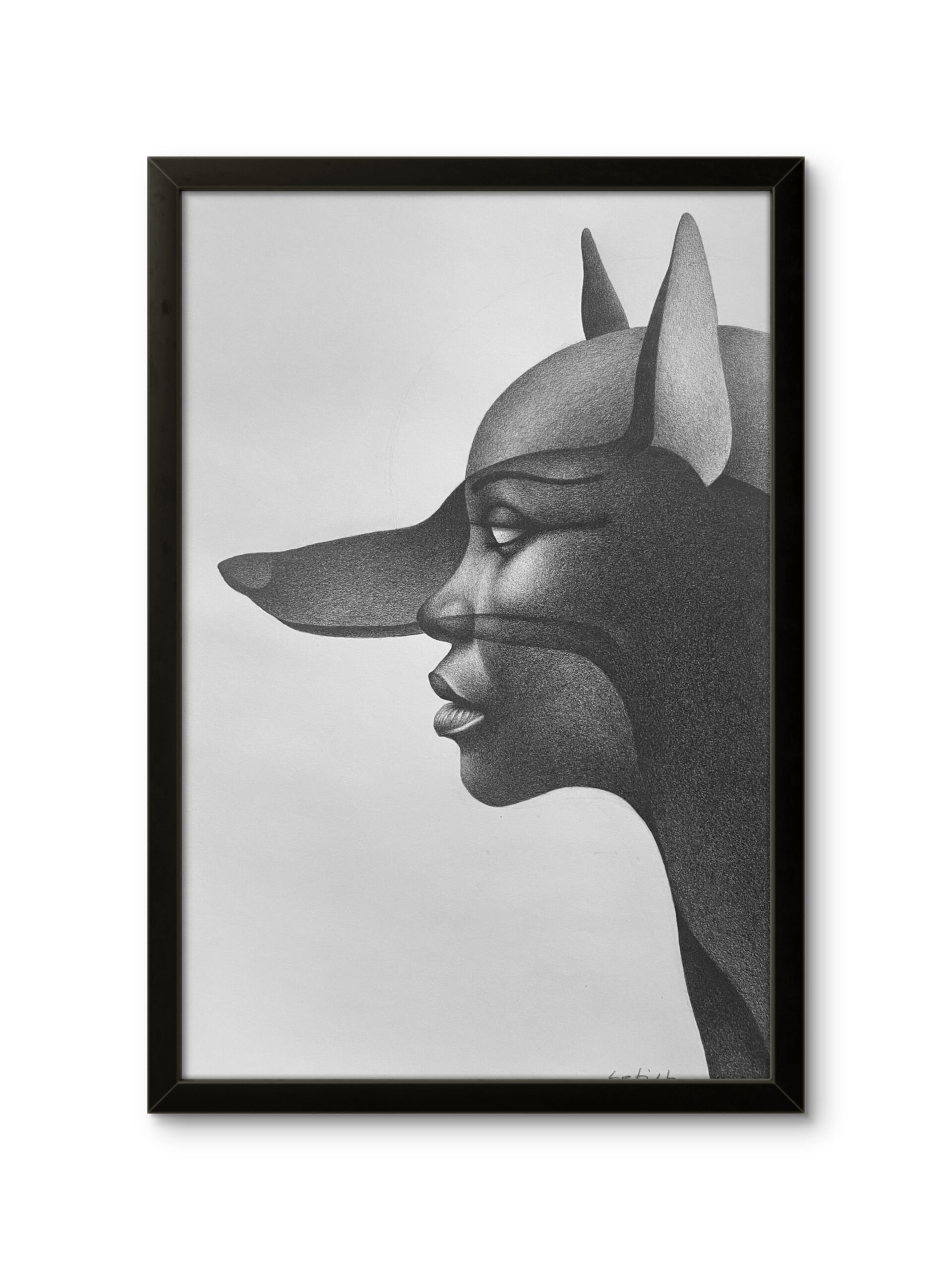 El trazo, paciente y controlado, genera una figura híbrida que juega entre lo humano y lo simbólico, con una elegancia silenciosa que atrapa desde la primera mirada.
