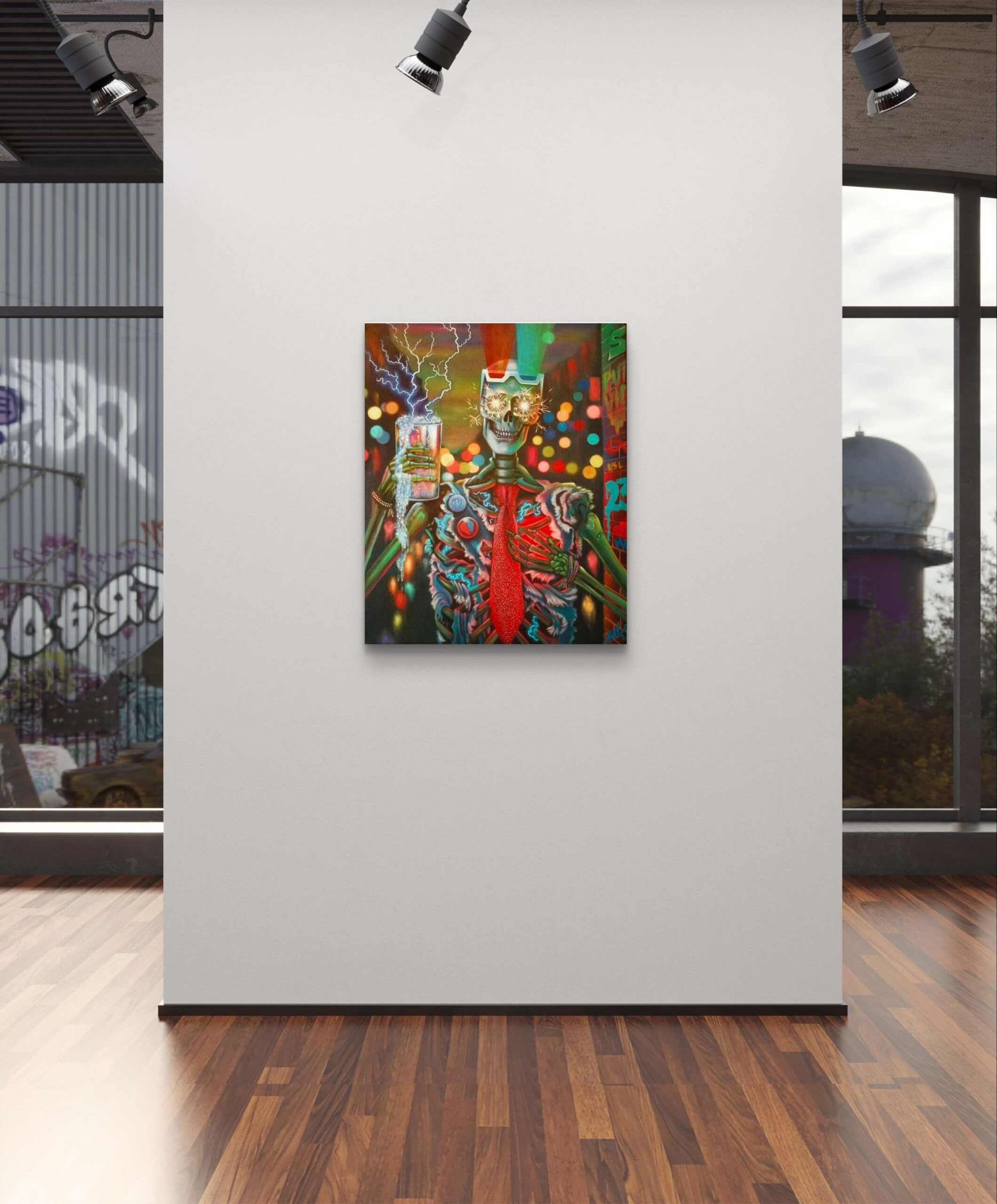 Realizada en acrílico sobre lienzo con bastidor, esta pieza de 90 x 70 cm es una explosión de magia visual y actitud, una obra que no se contempla: se siente.