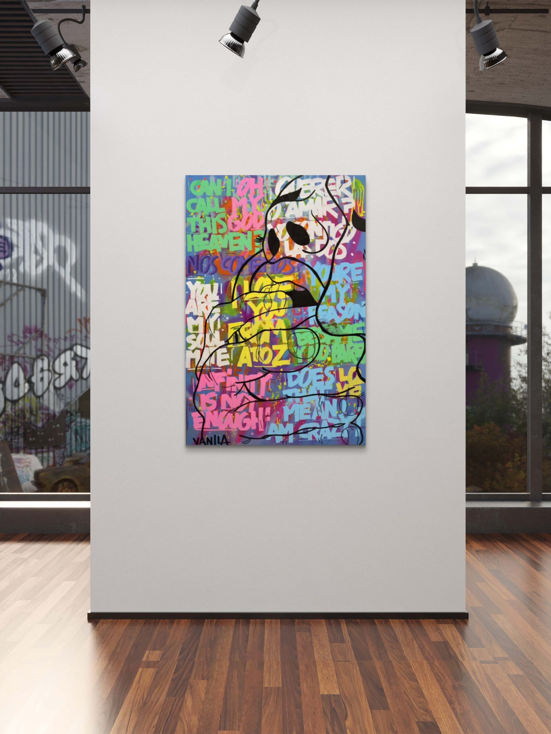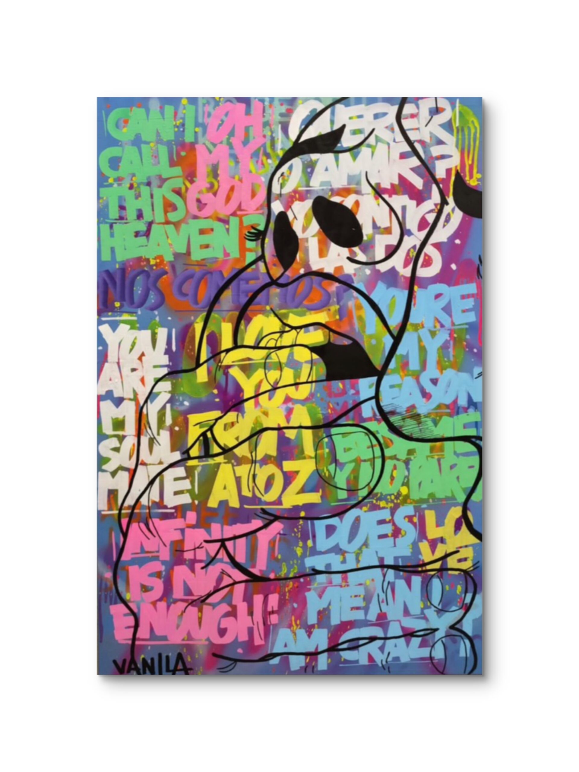 Esta obra combina diferentes técnicas, entre ellas acrílico, posca.. para conseguir retratos cargados de color, con tipografías urbanas y mensajes positivos que te atrapan al instante. Piezas vibrantes y contemporáneas, perfectas para llenar cualquier espacio de energía y actitud.