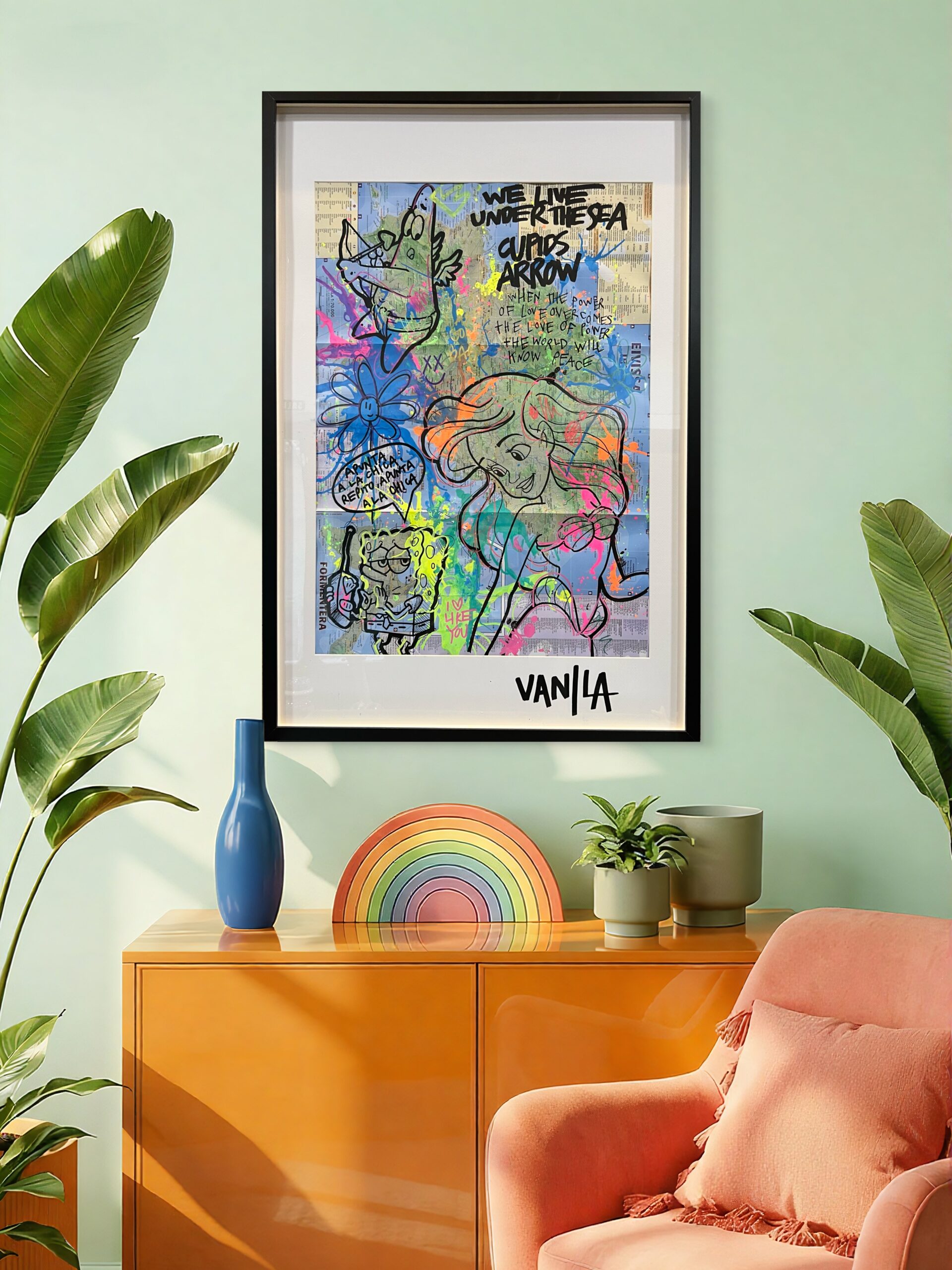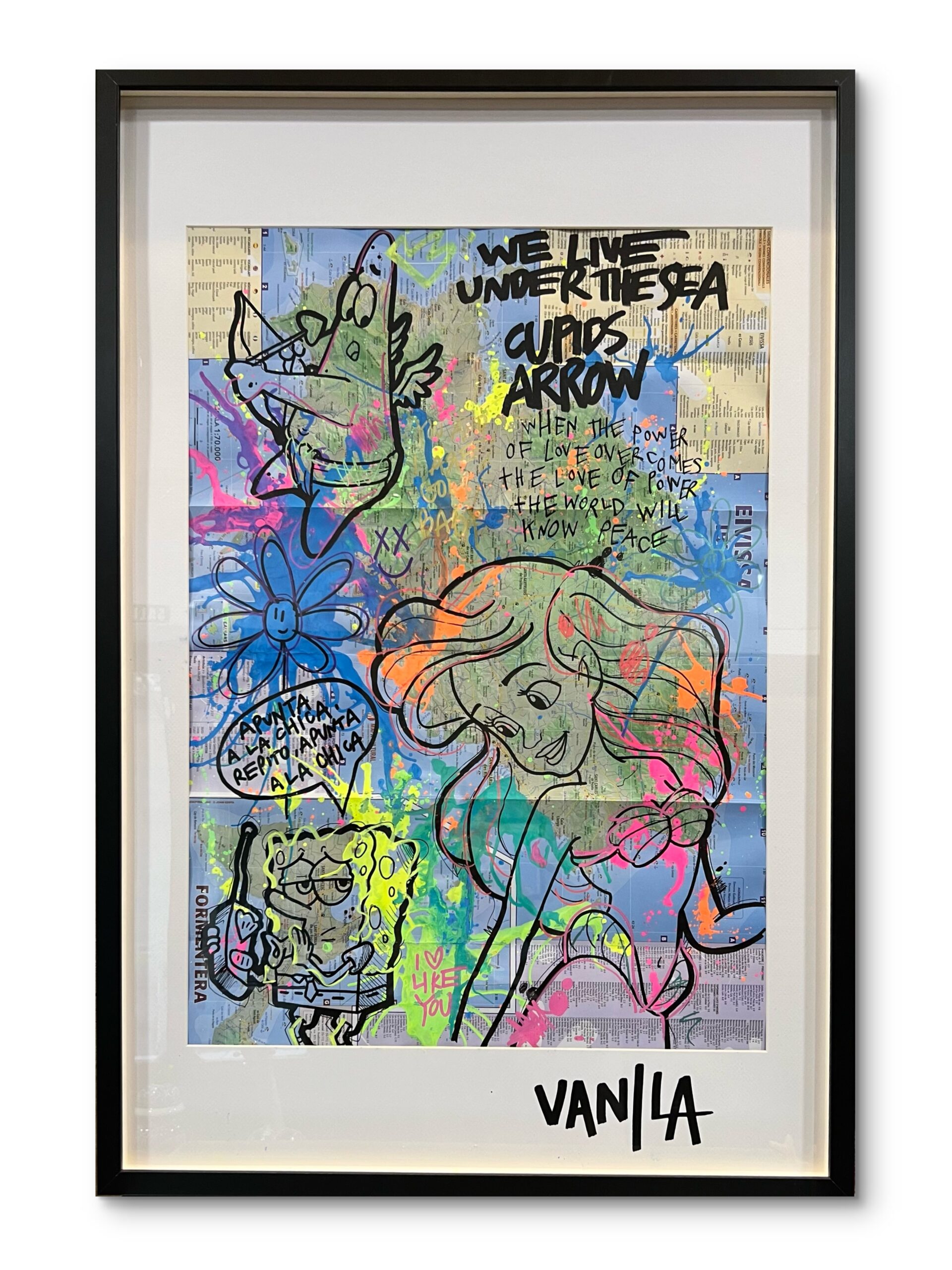 EDU VANILA  En esta pieza, Edu Vanila convierte el mapa de Ibiza en algo más que geografía: lo transforma en raíz creativa. No es solo un lugar, es un punto de partida. Un territorio emocional donde parte de su imaginario comenzó a tomar forma. Sobre el mapa —intervenido con su inconfundible trazo negro, personajes icónicos y explosiones de color— conviven referencias pop, mensajes de amor y guiños culturales que forman parte de su universo visual. Ariel, Bob Esponja, símbolos, frases… todo dialoga sobre una cartografía que deja de ser física para convertirse en autobiográfica. Ibiza aquí no es destino turístico: es origen, inspiración, energía vital. La superposición de capas (mapa, pintura, spray, dibujo) refuerza la idea de construcción artística: como si cada recuerdo y cada influencia quedaran marcados sobre el territorio. Una obra vibrante, urbana y profundamente personal. Técnica: Intervención mixta sobre mapa Medida enmarcada: 90 x 79 cm
